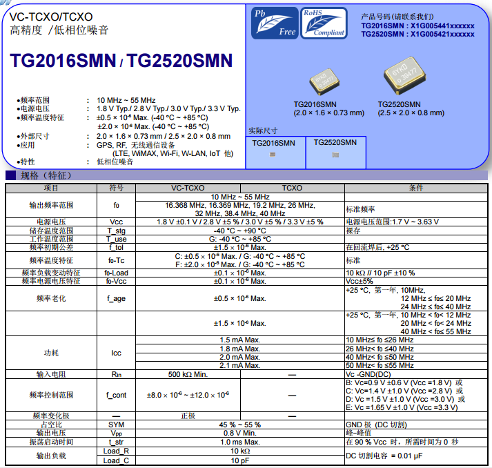 今天給大家介紹溫補晶振TG2016SMN,38.4MHz,MCGNNM,X1G0054410306。低相位噪聲溫補晶振TG2016SMN,是愛普生18年推出的TCXO溫度補償振蕩器。X1G0054410306此款料號對應(yīng)的頻率為38.4MHz,MCGNNM,尺寸大小為2.0X1.6X0.73mm,TG2016SMN具有低相位噪聲,低頻率,溫度穩(wěn)定性和老化性能。旨在提供卓越的性能。TG2016SMN與TG-5006CG/TG-5006Cj比較大幅度降低了相位噪聲,同時在在電源電壓、負載變化特性方面提升了一倍的性能,由0.2ppm降低到0.1ppm。TG2016SMN與去年熱銷的TG2520SBN與TG2016SBN兩對溫補晶振比較,明顯的差異在于擴大了頻率范圍,最低頻率由13MHz降低到了10MHz這個使用廣泛的頻點。TG2016SMN,38.4MHz,X1G0054410306只是比較熱銷的一種頻點,TG2016SMN常用的頻點還有:40MHz,26MHz,16.368MHz,16.369MHz,19.2MHz,32MHz,48MHz。TG2016SMN為Wi-Fi,GPS,蜂窩,物聯(lián)網(wǎng)LPWA和雙向無線電等無線應(yīng)用提供穩(wěn)定可靠的通信。下面南山電子就給大家提供TG2016SMN的規(guī)格書以供大家選型參考: