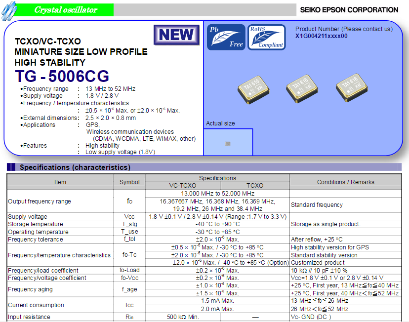 大家好,今天給大家介紹一款適用于GPS模塊晶振TG-5006CG-12H,26MHz,X1G004211000300。此款超小型溫補(bǔ)晶振TG-5006CG-12H,26MHz對應(yīng)的料號X1G004211000300,尺寸僅為2.5x2.0x0.8mm。TG-5006CG-12H輸出頻率范圍:13~52MHz,頻率公差低至±0.5ppm,振蕩啟動時間2.0ms,工作溫度范圍-30℃~+85℃。極高的溫度穩(wěn)定性,使TG-5006CG-12H可適用于GPS設(shè)備中,同時,TG-5006CG-12H,26MHz作為一款壓控溫度補(bǔ)償晶體振蕩器,可通過溫度補(bǔ)償電路降低由于環(huán)境溫度變化導(dǎo)致晶體振蕩器輸出頻率的變化,進(jìn)一步提升晶體振蕩器輸出頻率的穩(wěn)定度,X1G004211000300輸出電壓峰峰值為0.8V。該系列初始頻偏為2.0×10-6。此外,溫度帶來的頻率偏差是衡量TCXO溫度補(bǔ)償功能的重要指標(biāo)。在工作溫度范圍內(nèi),本系列在高精度(GPS)條件下的頻率溫度特征僅為0.5×10-6,在標(biāo)準(zhǔn)條件下僅為2.0 ×10-6。TG-5006CG-12H非常適合GPS定位和各類可穿戴設(shè)備,并且廣泛應(yīng)用于GPS、RF、無線通信設(shè)備領(lǐng)域。下面南山電子就給大家分享下TG-5006CG-12H,26MHz,X1G004211000300規(guī)格書:
