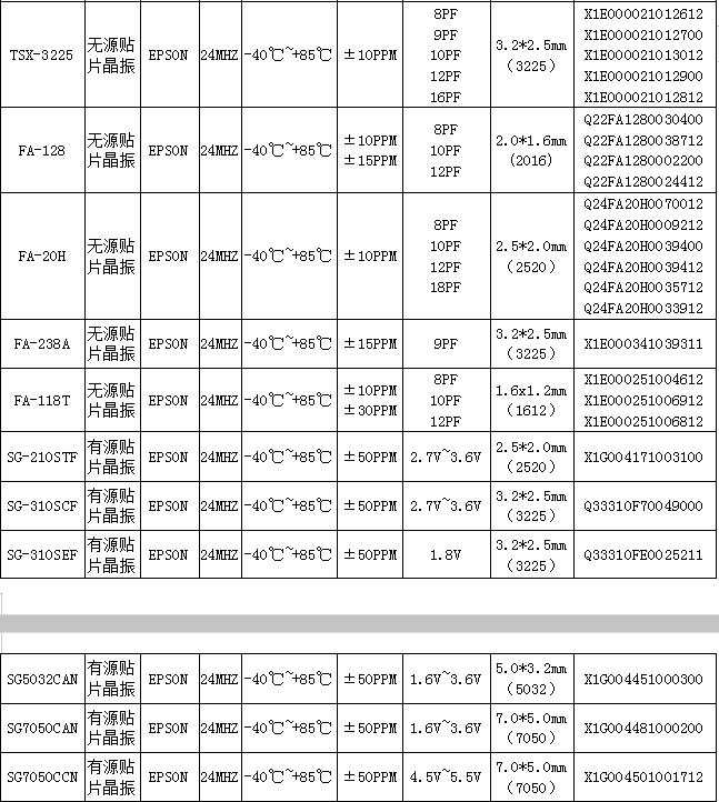 24mhz晶振是市面上使用量非常大的一個頻點。愛普生晶振24mhz包含無源晶體諧振器、有源晶體振蕩器、高精度有源溫補晶振等等尺寸豐富、穩(wěn)定性更好的產(chǎn)品。在24mhz有源晶振方面,提供3.3V和5V兩種電源電壓,尺寸主要是2520。高精度溫補晶振方面也以2016、2520和5032為主。在24mhz有源晶振方面,因提供3.3V和5V兩種電源電壓,尺寸主要是2520。高精度溫補晶振方面也以2016、2520和5032為主。南山電子作為愛普生晶振授權(quán)中國地區(qū)核心代理商,通過我們的客戶調(diào)研,特地為大家篩選出來哪些終端需要用24mhz晶振 : 1.顯示器,2.鼠標,3.手機MTK方案TCXO,4.玩具游戲類(遙控)游戲機,安防類(攝像頭,報警器),音響數(shù)字效果器,對講機等,當然不同類型的產(chǎn)品有的需要24mhz晶振有源的,有的需要晶振24mhz無源的。南山電子為大整理出來24mhz晶振的一些常見的型號規(guī)格參數(shù)供大家選型: