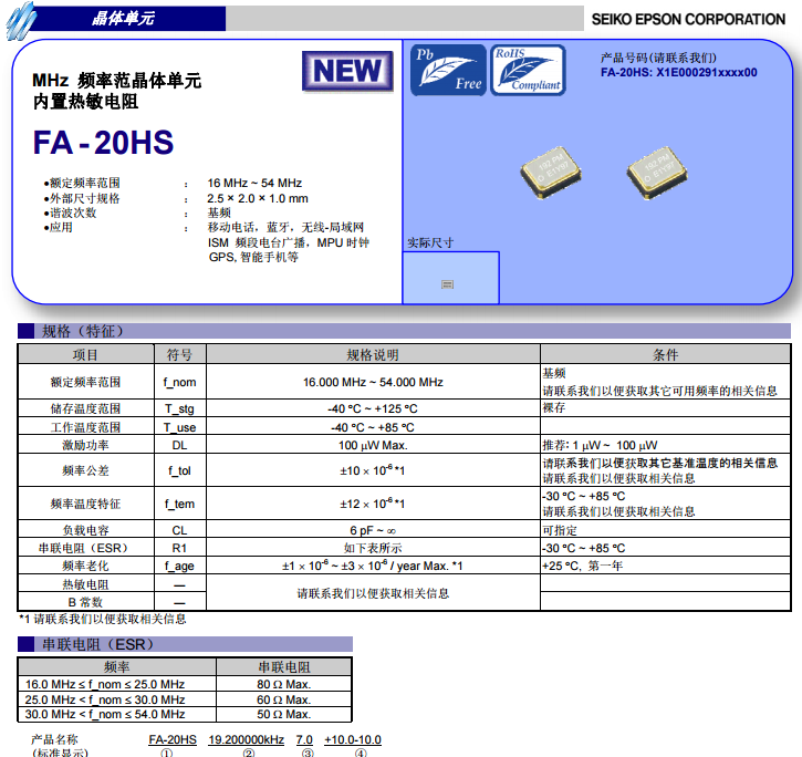 說到熱敏晶振很多人一定比較陌生,顧名思義,熱敏晶振就是內(nèi)置熱敏電阻的晶振,也可以稱為熱敏電阻晶振。今天就給大家介紹愛普生熱敏晶振的常用型號(hào)FA-20HS的特征和選型。首先我們來說說熱敏晶振的特征,有溫度傳感器的熱敏晶振在工作過程中受到了溫度感應(yīng)時(shí)可以使晶體產(chǎn)品在工作過程中保持一個(gè)精準(zhǔn)的不變的溫度,使晶振產(chǎn)品的精度給CPU提供信號(hào)的同時(shí)又能避免因?yàn)闇囟鹊膯栴}給晶振造成頻率較大的偏差。其實(shí)說白了,熱敏晶振就是為了可以代替昂貴的溫補(bǔ)晶振成本而制造的,雖然熱敏晶振并不能代替的溫補(bǔ)晶振,但是適合使用在一些常用電子產(chǎn)品如的智能手機(jī),空調(diào)等。熱敏晶振采用的原理就是在普通貼片晶振的基礎(chǔ)上增加了一顆熱敏電阻,以及一顆變?nèi)?a href='http://ly-studio.cn/tiepianerjiguan.html' target='_blank'>二極管,利用了變?nèi)荻O管的容變功能在結(jié)合熱敏的傳感功能相結(jié)合,就變成了今天這個(gè)帶有溫度傳感功能的熱敏石英晶振,如愛普生推出的小尺寸內(nèi)置熱敏電阻的晶振FA-20HS。熱門頻點(diǎn)為FA-20HS  26MHz 7.8pF 10ppm 料號(hào)為X1E0002910026。下面南山電子就給大家分享下熱敏晶振FA-20HS規(guī)格書以供大家選型參考: