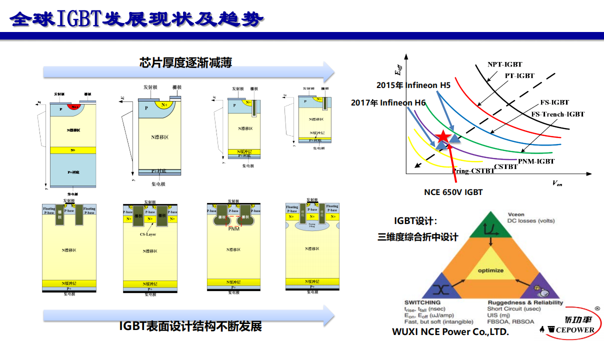IGBT模塊產(chǎn)品發(fā)展的趨勢是芯片厚度逐漸減薄,IGBT表面涉及結(jié)構(gòu)不斷發(fā)展。隨著以軌道交通為代表的新興市場和新能源車行業(yè)的興起,將進(jìn)一步為