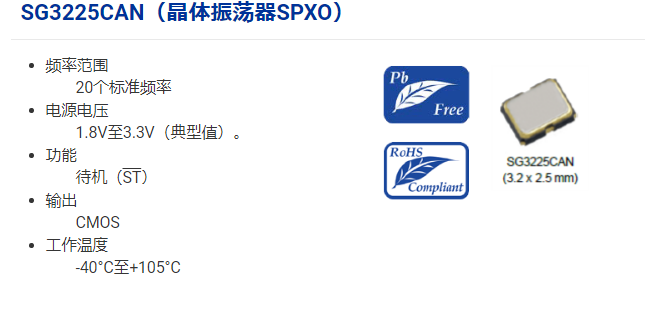 SG3225CAN的輸出類(lèi)型為CMOS輸出,電源電壓1.8V至3.3V(典型值),頻率范圍4—72MHz,工作溫度-40°C至+105°C。SG3225CAN的啟動(dòng)時(shí)間5Ms,包含待機(jī)功能。