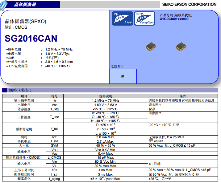 EPSON公司推出的5G晶振SG2016CAN,是一款CMOS輸出的晶體振蕩器。頻率穩(wěn)定度可達±50PPM,頻率老化度僅為±3PPM/year,具有較高的穩(wěn)定性,滿足光模塊長期使用的要求。SG2016CAN封裝小,尺寸為2.0mm×1.6mm×0.7mm,光模塊體積小,采用2016封裝,更容易PCB設計。SG2016CAN的工作溫度范圍:-40℃~105℃,具有較高的工作溫度。5G前傳光模塊中,一般需要選擇寬溫的工作期間,所以5G晶振也需要更高的溫度范圍,使用SG2016CAN可以滿足光模塊高溫的需求。下面南山電子就給大家看下5G晶振SG2016CAN的規(guī)格書,以供大家選型參考: