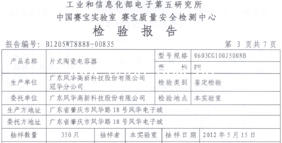 二、檢驗(yàn)樣品來源:總數(shù)350只,由中國賽寶實(shí)驗(yàn)室自行在風(fēng)華高新科技股份有限公司成品庫抽取后,帶回實(shí)驗(yàn)室。本次抽檢型號為:0603CG100J500NB。