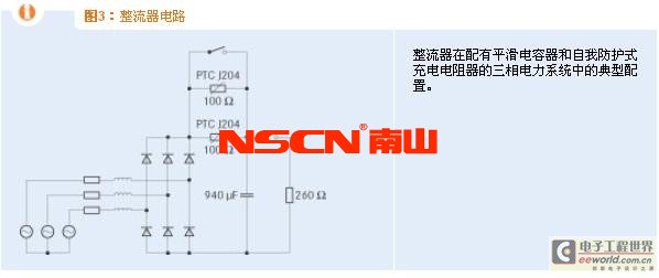 強(qiáng)大的沖擊電流在約150 ms之后使兩個(gè)自我防護(hù)式充電電阻器產(chǎn)生高電阻性,進(jìn)而限制電流。而流經(jīng)固定電阻器的電流則僅由極低的電源線電阻進(jìn)行限定,因此固定電阻器中會(huì)產(chǎn)生非常高功率的能量轉(zhuǎn)換。