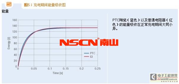 在短時(shí)間內(nèi),并聯(lián)的兩個(gè)自我防護(hù)式充電電阻器與外界達(dá)到熱平衡,同時(shí)由于PTC陶瓷的高電阻值,吸收的能量?jī)H有略微上升。最終產(chǎn)生的能量吸收與圖7所示類似。