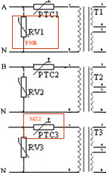 熱敏電阻和T1初級串聯(lián)的回路中的電流為電表正常的電流。當輸入電壓變大時(一般是接地故障),熱敏電阻和T1初級串聯(lián)的回路中的電流也將變大,當此電流達到或超過熱敏電阻的動作電流時,熱敏電阻將動作,熱敏電阻阻值會變大,而阻值變大的速度取決于此時電流的大小,電流越大,速度越快。當熱敏的阻值變大時,由歐姆定律I=U/R,可以得出整個回路的電流將變小。