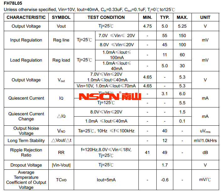 三端穩(wěn)壓器有效利用幾個固定電壓得到較寬的應(yīng)用范圍,可替代混合 的齊納二極管和電阻時,而且更低的靜態(tài)電流。適合 100mA 的各種穩(wěn)壓要求。這些電壓可以用在邏輯系統(tǒng),檢測儀器,HIFI ,和其他點子設(shè)備??梢蕴娲^熱保護 IC。以NSP-78LXX 為例,主要參數(shù)如下