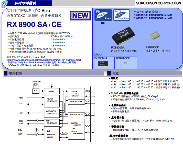 愛普生時鐘芯片模塊RX-8900共有兩種型號分別為RX-8900SA和RX-8900CE,兩種同屬8900系列肯定有較多共同點,如均內(nèi)置32.768KHz晶體單元,DTCXO數(shù)字溫補晶振,均有高精度穩(wěn)定性,內(nèi)置電源切換,應用在安防等,消費類等。