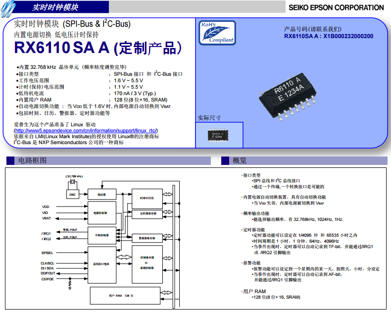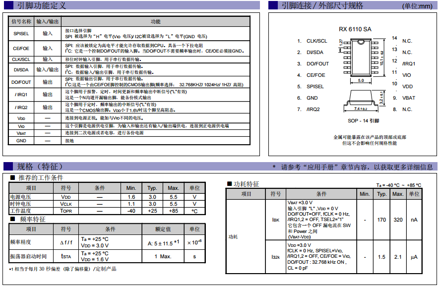 RX6110SA時(shí)鐘芯片模塊是一款性價(jià)比較高的實(shí)時(shí)時(shí)鐘芯片,因其具有超低功耗,相比于MCU方案,節(jié)約800%功耗,內(nèi)置電源切換,低電壓計(jì)時(shí)保持SPI&I2C-BUS。RX6110SA被應(yīng)用在時(shí)鐘功能的各種電子設(shè)備,最適于使用大容量電容備用的處理系統(tǒng),能為顧客處理系統(tǒng)的低耗電及降低設(shè)計(jì)量做貢獻(xiàn),而且,RX6110SA設(shè)有可用于記錄處理系統(tǒng)工作和備用等時(shí)間的長(zhǎng)時(shí)間累計(jì)定時(shí)器,還搭載了32.768kHz輸出、報(bào)警功能、固定周期定時(shí)器中斷功能和RAM等各種功能。RX6110SA選型——具體可以查看規(guī)格書如下: