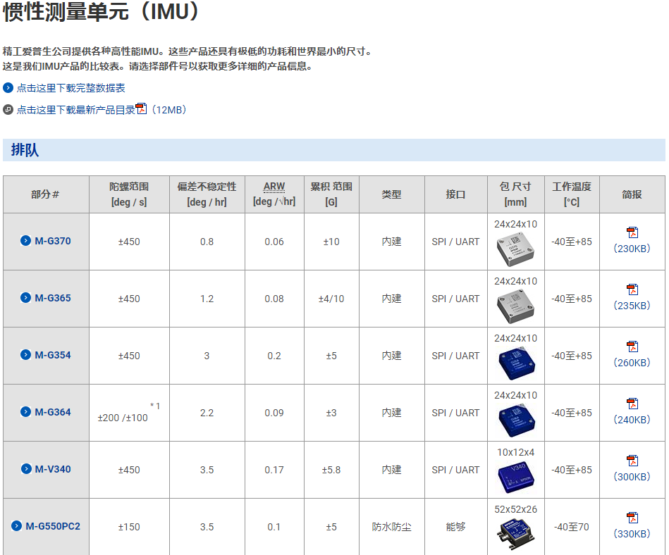 近日,愛普生推出了六軸陀螺儀的全新型號:M-G325。M-G325是一款性能達到光纖陀螺儀(FOG)級別的高性能慣性測量單元,六軸陀螺儀M-G325將成為愛普生新一代IMU的標準。M-G325采用了最新開發(fā)的高性能傳感器,具有穩(wěn)定性更好、噪音更低、動態(tài)范圍更廣的優(yōu)越特點,而且動態(tài)性能出色(比例因子非線性),非常適合諸如汽車、無人飛機等從靜態(tài)到高速運動的高精度測量。早在2011年,愛普生就發(fā)布了旗下首款IMU,可以正確檢測出包含從微小的傾斜到大范圍動作在內的慣性運動信息。自此,愛普生慣性測量單元便在航空航天以及工業(yè)產品中得到了廣泛應用,并因杰出的質量和性能而贏得高度贊譽。隨著自主精密農業(yè)機械、智能施工機械和無人機應用的快速發(fā)展,小型高性價比、高精度定位裝置的需求與日俱增,而愛普生最新開發(fā)的六軸陀螺儀M-G325憑借出色的表現(xiàn)為自動駕駛和導航提供FOG級性能。愛普生MEMS六軸陀螺儀FOG光纖陀螺儀相比從性能參數看非常接近,特別是EPSON最新推出的M-G325等系列參數已經達到了FOG戰(zhàn)術級性能水平,但其成本卻比MEMS低出數倍。如果可以使用GNSS,而且應用的目的是在開放天空環(huán)境中運行,六軸陀螺儀可以取代OG光線陀螺儀。如果應用能夠接收車輛或平臺速度更新,則六軸陀螺儀系統(tǒng)可以達到與獨立FOG系統(tǒng)相同的水平。這將迅速加速六軸陀螺儀在自動駕駛汽車等領域的推廣應用。下面南山電子就給大家匯總下除了M-G325,愛普生之前推出的慣性測量單元IMU的具體參數規(guī)格以供大家選型參考: