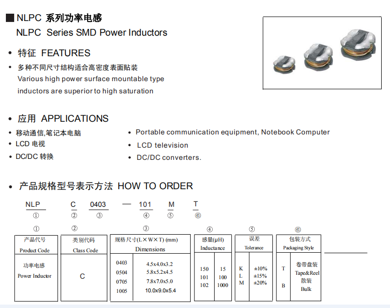 今天來介紹下功率電感,那么功率電感與普通電感到底有哪些區(qū)別呢?首先,其實(shí)任何電感通電時都有一定的功率,此功率一般是是無功功率,如果電感中通過的電流要比導(dǎo)線的飽和電流小很多,一般不稱之為“功率電感”。所謂功率電感,一般指那些電流較大的電感,除了電感量之外,還要考慮通過電流大小。當(dāng)然如果電感的電流較大,而電壓也很高,就是功率電感了。那么貼片功率電感功率電感又有哪些區(qū)別呢?功率電感其實(shí)是一個籠統(tǒng)的說法,功率電感一般分為貼片功率電感和直插功率電感。貼片功率電感也可以稱為繞線電感,而直插功率電感一般具有燕高效率及高飽和電流。一般應(yīng)用在打印機(jī),液晶電視,復(fù)印機(jī)上。南山電子主要與風(fēng)華高科合作,代理風(fēng)華的功率電感,一般有以下幾個系列:MS功率電感,PIO功率電感,PRS功率電感,HA功率電感等,除了風(fēng)華高科品牌,NLP功率電感是南山電子自主品牌產(chǎn)品線之一。目前NLP功率電感主要推出NLPC系列、NLPF系列、NLPE系列、NLPM系列、NLPP系列、NLPH系列等主要六個系列功率電感產(chǎn)品。型號規(guī)格可以替代風(fēng)華高科相關(guān)系列功率電感,在這里選擇其中一個NLPC系列功率電感規(guī)格書如下: