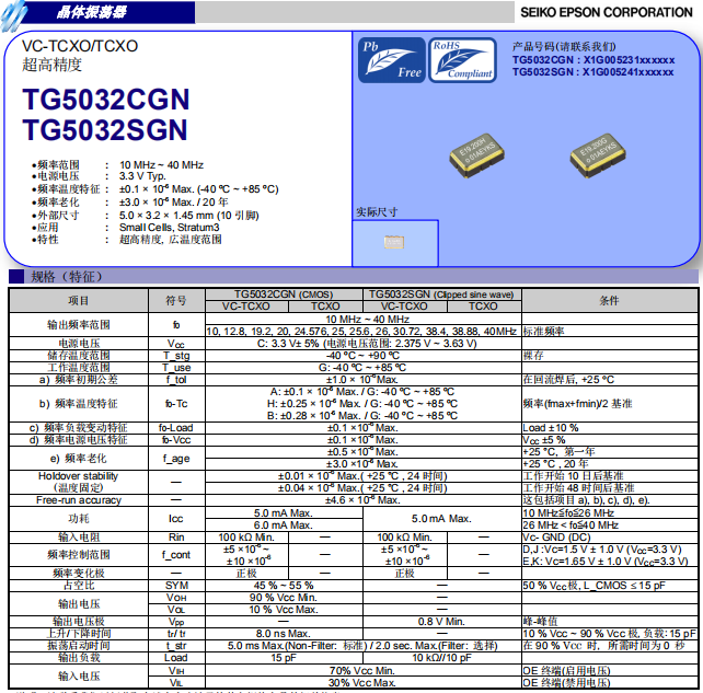我們就隨便挑選兩個(gè)5032溫補(bǔ)晶振TG5032CGN和TG5032SGN來作為代表介紹下: