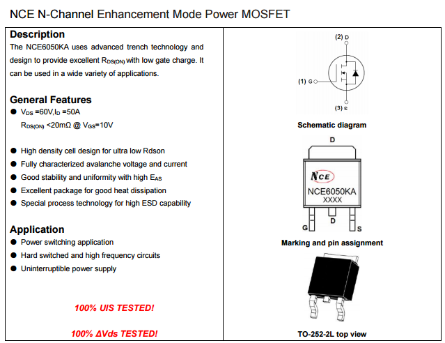 大家好 ,今天給大家介紹一款適用于60V電動車控制器的可替代國外型號的MOS管NCE6050KA。場效應管NCE6050KA是一款60V漏源電壓,50A電流,TO-252封裝的N溝道MOS管,說到60V和50A,我想甚至連不太接觸電子元器件的人也有點熟悉,好像在哪里見過,相信大家都買過電動車,一般買的時候肯定聽過電動車是60V或者48V的。NCE6050KA就是一款適用于60V電動車控制器的場效應管。目前在60V電動車控制器的應用中,MOS管主要損耗包括開關(guān)損耗(開通過程和關(guān)斷過程),導通損耗,截止損耗(漏電流引起的,這個忽略不計),還有雪崩能量損耗。只要把這些損耗控制在MOS管承受規(guī)格之內(nèi),MOS管即會正常工作。所以選取一款合適的MOS管是很有必要的,常用的60V電動車控制器有捷捷微的JMTK50N06B,新潔能的NCE6050KA,都是不錯的選擇,近期市場上NCE6050KA貌似很受青睞,我們南山電子就備有庫存,下面就給大家分享下60V電動車控制器的常用型號NCE6050KA的規(guī)格書: