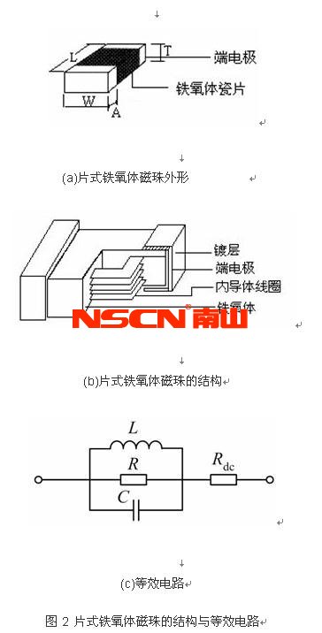 片式磁珠是目前應(yīng)用、發(fā)展很快的一種抗干擾元件,廉價(jià)、易用,濾除高頻噪聲效果顯著。片式磁珠由軟磁鐵氧體材料組成,片式鐵氧體磁珠的 結(jié)構(gòu)和等效電路如圖2所示,實(shí)質(zhì)上它就是1個(gè)疊層型片式電感器,是由鐵氧體磁性材料與導(dǎo)體線圈組成的疊層型獨(dú)石結(jié)構(gòu)。由于在高溫下燒結(jié)而成,因而具有致密 性好、可靠性高等優(yōu)點(diǎn)。兩端的電極由銀/鎳/焊錫3層構(gòu)成,可滿足再流焊和波峰焊的要求。在圖2所示的等效電路中,R代表由于鐵氧體材料的損耗(主要是磁 損耗)以及導(dǎo)體線圈的歐盟損耗而引起的等效電阻,C是導(dǎo)體線圈的寄生電容。