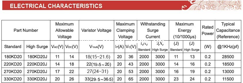 V1mA ——在1mA 測(cè)試下的壓敏擊穿電壓;IMP 8/20μ S 最大雷擊電流指標(biāo);